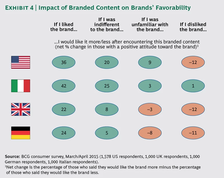 Branded content is a powerful tool for many brands. Many brands can use branded content to create and deepen consumer engagement, as well as increase the likelihood of a purchase. While there are distinct national differences (see below), consumers in the four markets we surveyed generally like and trust a brand more—and are more likely to purchase it—after encountering branded content. Of particular significance for marketers, this finding applies to brands about which consumers previously had no clearly defined attitude.