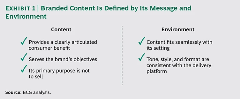 consumer benefit in the service of a brand. Second, the content is consistent with its setting—that is, it fits with the medium or method that delivers it from both a creative and a contextual point of view. (See Exhibit 1.) Not all branded content is created equal, but all marketers that consider using it should seek to satisfy these criteria. They are the price of admission that will allow them to continue to play.