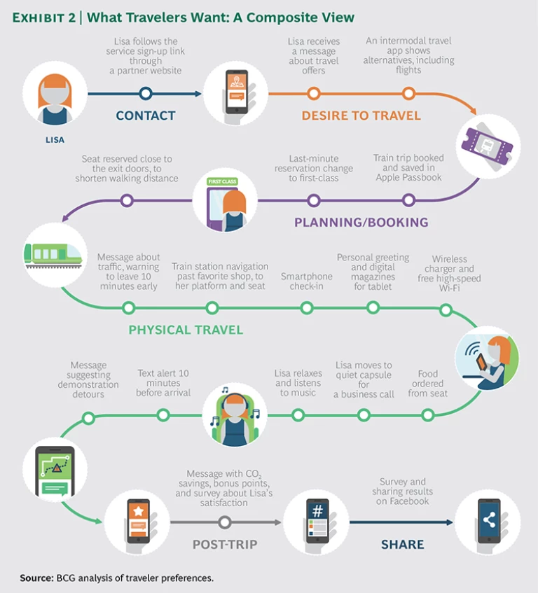 To redefine the customer experience, the company mapped out the passenger’s journey, from initial travel inspiration through the last mile of the trip and beyond, ending with sharing feedback and memories on social networks. The company also created detailed profiles of business, elderly, and commuter travelers based on its ethnographic interviews and market research. This exercise enabled the company to identify its passengers’ frustrations and unmet needs along the customer journey. Company executives then laid the groundwork for fixes and improvements by using the digital tools at their disposal. They identified more than 400 potential improvements and selected 50 to implement.
