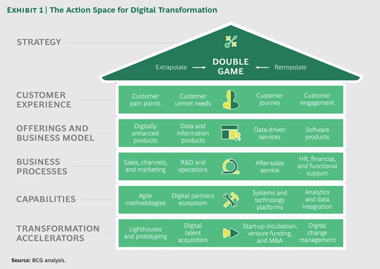 The elements of digital transformation are, of course, interdependent and mutually reinforcing. A large, state-owned rail and logistics company took a three-tiered approach to digital transformation that illustrates the action space’s many interdependencies and points of overlap. (See Exhibit 2.) First, it redefined the customer experience and implemented new ways to launch and scale up initiatives. Second, it defined a target state of digital transformation ten years in the future. Third, it prepared its people, processes, and offerings for the double game. The company also sent executives on immersion tours to Silicon Valley, created a digital lab, and completed its first digital acquisition.