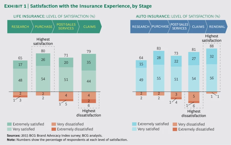 One of the surprises of the survey results is that advocacy scores for auto insurers are higher than those for life insurers. Automobile accidents are among life’s inevitable frustrations, and even when they are minor, the aftermath—filing a claim and collecting payment—is often tedious, time-consuming, and expensive. Yet, during most interaction stages—claims included—auto insurance customers express more satisfaction with their providers than do life insurance customers, and auto insurers have higher overall brand-advocacy scores (44.3 versus 36.8 for life insurers).