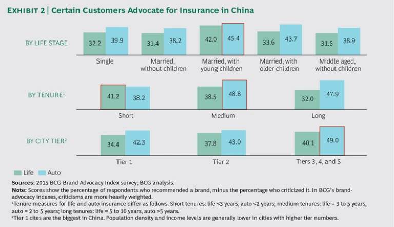 The truism that those who live in big cities are harder to please holds for Chinese insurance customers. Both auto and life insurance providers have more brand advocates in tier 3, tier 4, and tier 5 cities (which have smaller populations and less competitive insurance markets) than in tier 1 cities such as Beijing and Shanghai.