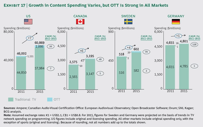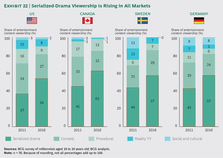We undertook an in-depth assessment of OTT across these markets, and at times, its impact on one representative country from each of these categories. These four countries are the US and Canada (English speaking), Sweden (high-proficiency English), and Germany (non-English speaking). Our examination included secondary research and proprietary BCG analysis, interviews with some 20 content production experts worldwide, and a short survey in which we asked more than 600 millennials in 50 countries about their interaction with content—foreign and domestic. Such an analysis carries imperfections, of course, as variables other than OTT have an impact on domestic-market content creation (for example, high growth in pay TV penetration, changes in subsidies, and changes in exchange rates), but we have attempted to control for those variables.