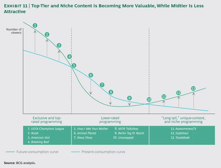 A second unequivocal truth is that the middle of the content market—mid-level quality content produced for a mass-market audience (what the US TV industry used to call the lowest common denominator)—is collapsing while the top and bottom ends thrive. (See Exhibit 11.) The massive increase in available content has simultaneously reinforced the importance of top-quality content in a cluttered world and enabled the superserving of endless niche audiences with almost infinitely narrow interests and desires. As one leading media industry executive put it, “Yes, we are in the golden age of TV for consumers: every need state can be satisfied. This strategy of appealing to all customer segments has come at the expense of midtier content, which originally tried to appeal to everyone.”
