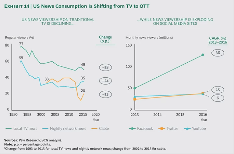 Niche Professional Content. With the decline in traditional television viewership of news and entertainment, backfilling has occurred in the form of niche content. Broadcast news in the US—national and local—has been declining significantly for years, but there are now at least a half-dozen cable news networks, each delivering its own point of view on many of the same newsworthy topics. These networks target niche audience segments, some of which comprise no more than a few hundred thousand viewers in prime time. On the internet, more than 100 OTT US news websites garner more than 1 million unique visitors per month. And this dynamic is not only in the US. Canada, for instance, has nearly a dozen OTT news websites with the same level of visitors. Virtually all of these sites feature significant video content, which would have been impossible over the facilities-based TV infrastructure. News has also been supported by the growth of social media as a distribution platform. Millions of consumers go to social media platforms as their core destination for breaking news, and, more often than not, this news is rooted in video. According to Reuters Institute for the Study of Journalism, 12% of consumers use social media as their main source for news. (See Exhibit 14.)