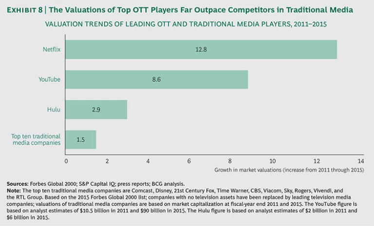 Of these five behemoths, Facebook and YouTube are focused primarily on ad-supported, pro-am, and amateur content. Hulu, Netflix, and Amazon Prime deliver traditional professionally produced content and generate mostly subscription revenues. Together, the five companies have created enormous market value. Netflix, Hulu, and YouTube have grown many multiples above the index of traditional video media companies and have generated huge rewards for their owners. As of mid-2016, Netflix’s market capitalization was approximately $50 billion, while according to some equity research reports, YouTube was estimated to be worth as much as $90 billion, and Hulu’s value was pegged at some $6 billion. (See Exhibit 8.)