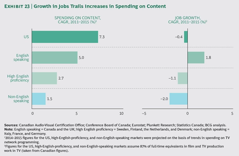 In professional content, growth in production dollars is not necessarily translating to more job activity. In nearly every market observed, irrespective of language, job growth lagged behind the growth in production dollars. (See Exhibit 23.)
