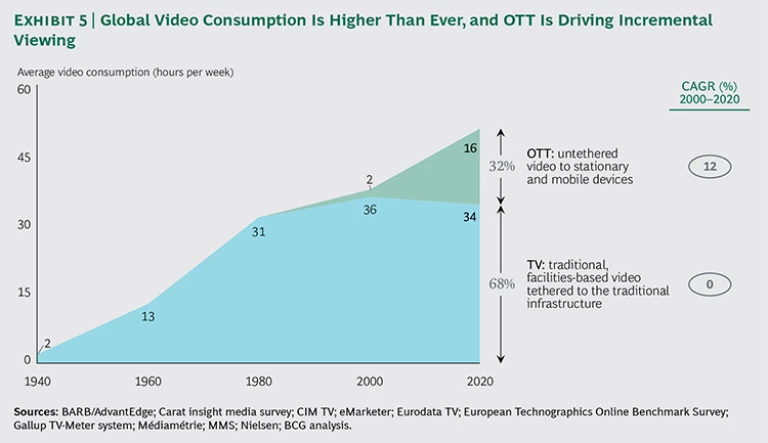 Place Shifting. The proliferation of mobile and streaming access (as well as portable media devices with ever-larger and higher-definition screens) has enhanced consumers’ ability to choose what they watch (scheduled programming versus streaming video) and when and where they watch it (at home or on the go). For example, Facebook says that 90% of its daily active users access the platform through mobile devices. Viewing statistics tell the story: since 2009, overall viewership in the US is up by three hours per week, and almost all of the increase is viewing that is not tethered to traditional facilities-based TV. And although this trend was initially centered in the US, it has spread around the world. Indeed, by 2020, online viewing will account for more than 30% of all video consumption—some 16 hours per week for the average viewer, who, in the early years of this century, watched only a couple of hours of video each week. Online viewing has increased the size of the overall video pie rather than cannibalizing it and has created new consumption opportunities for video viewing both at home and away from home. (See Exhibit 5.)