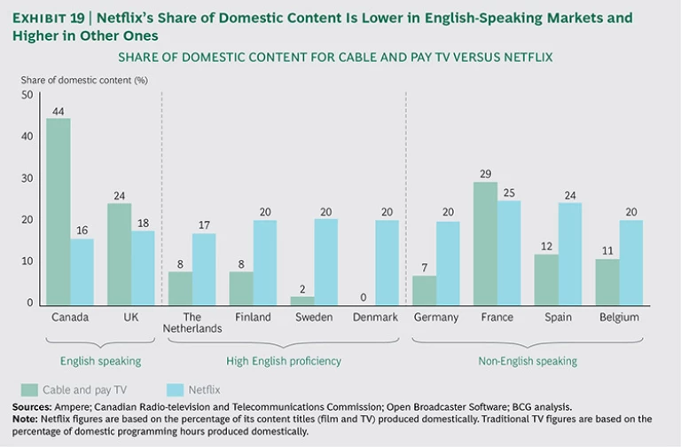 Global OTT players seem to compete more with local-language content (primarily acquired rather than original productions) in non-English-speaking markets than in English- speaking markets. Netflix, for example, has a higher share of domestic productions in non-English-speaking markets such as Germany and France than in English-speaking markets such as the UK and Canada. (See Exhibit 19.) The reasoning is that because most foreign content is in English, local-language content in those markets is critical for winning domestic consumers. One executive at a large Swedish FTA broadcaster explained, “Breaking Bad and House of Cards are important, but to win you need to supplement them with local titles—programs in the local language that people can relate to and watch without subtitles.”
