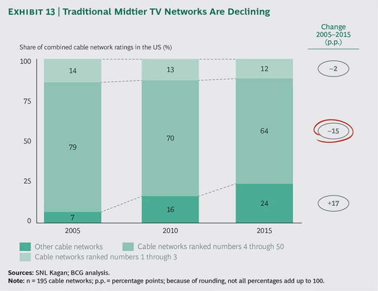 These trends are evident in traditional TV viewership. Top networks and niche networks are gaining audience share, while midtier general-entertainment networks in competitive OTT markets with mature pay TV ecosystems, such as the US, are declining. (See Exhibit 13.)