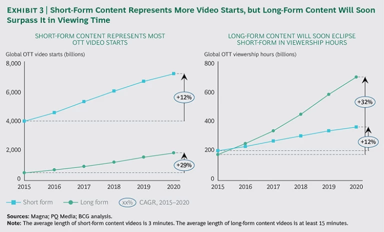 All three types of content creators have been fueling the massive growth in OTT. Pro-am and amateur players are primarily short-form creators, and they are driving much of the out-of-home growth in video consumption, especially mobile short-form video “starts,” or the number of videos that consumers watch. Traditional professional OTT content, which is primarily long form, is taking up a growing share of consumers’ viewing time and cannibalizing more of the at-home viewing experience. (See Exhibit 3.)