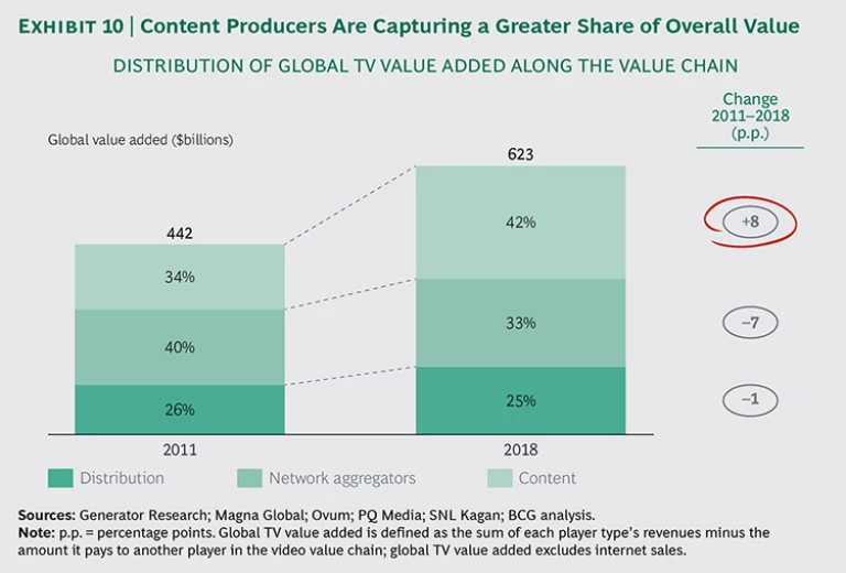 Content owners and creators are gradually increasing their share of the value captured relative to that of network aggregators and distributors, as the traditional TV ecosystem struggles with the loss of subscribers and advertising dollars to OTT. This isn’t true for all markets, of course. Some markets are at the apex of growth for pay TV and are supporting a healthy downstream value chain of participants, such as network aggregators and video distributors. For instance, in Brazil, which has been benefiting from the middle class and improving infrastructure, pay TV penetration has been increasing at 10% per year since 2010, with all traditional participants benefiting. And although there are players outside the pure-play video value chain that are creating real value and growing on the back of OTT (for instance, broadband service providers and content delivery networks such as Akamai Technologies and OTT enablers such as BAM Technologies), in most markets, especially developed markets, OTT is facilitating a value shift from traditional video distribution to content creation in the video value chain. (See Exhibit 10.)