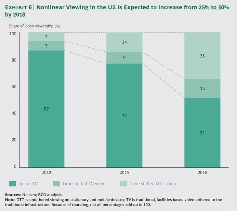 Time Shifting. The combination of the shift in viewing to OTT, which caters to an on-demand content experience, and distributors’ development of “free” VOD services, has moved consumers away from linear “appointment viewing.” Today, nearly a quarter of all viewing hours is nonlinear or time-shifted viewing, either tethered or untethered to traditional facilities-based distribution. The US is ahead in this: by 2018, nearly half of all US viewing is expected to be nonlinear. But as with online and mobile video growth, the rest of the world is following fast. (See Exhibit 6.)