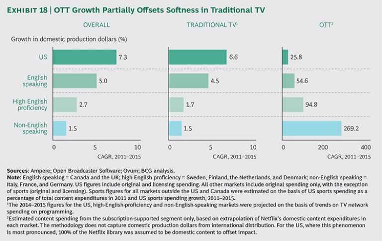 Specific trends, of course, vary significantly by market. English-speaking markets, led by the US, have clearly been benefiting most. Non-English-speaking markets do not reflect the same booming growth. Even though relative OTT growth is actually higher in non-English-speaking markets, the base is very small, and thus cannot offset slower growth in traditional TV relative to English-speaking markets. (See Exhibit 18.)