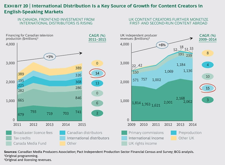 The bearish case is built on the concern that OTT will undermine the traditional ecosystem, that advertising and subscription dollars will dry up, and that investment in content will consequently be squeezed. At the same time, production and content acquisition across individual markets will become more international in nature, as domestic-only players cede share to multimarket buyers with stronger acquisition and distribution economics and greater purchasing leverage. This scenario suggests a perceived, and possibly real, threat to domestic producers’ ability to monetize content in international markets, despite positive trends today. It is worth noting that the naysayers do cite a few exceptions for non-English-speaking countries, including the following: local-market content is so important in some markets, for example, France, that it is immune to globalization; local-market content may travel better internationally from certain markets, such as Canada; and some local markets, such as India, have enough scale and monetization opportunities themselves to sustain high levels of both global and local investment.