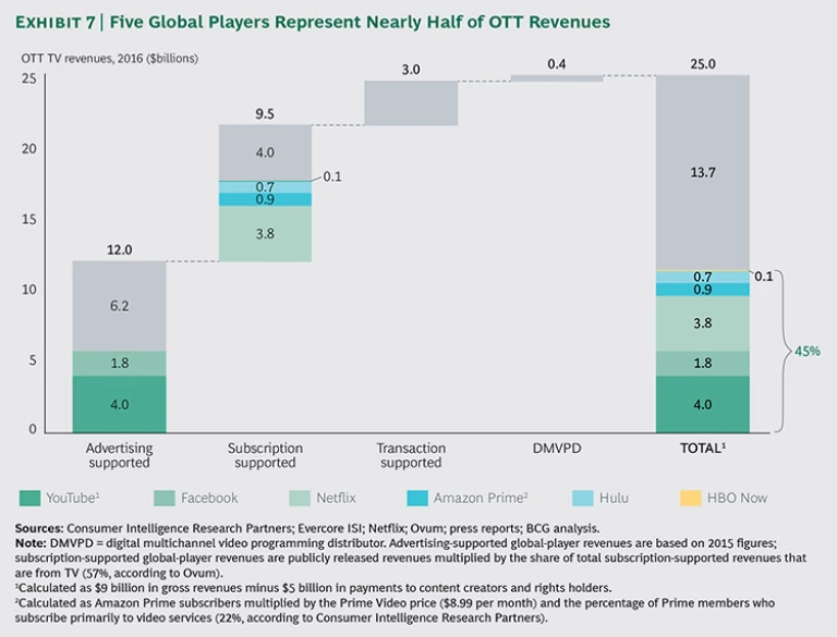 Even though OTT has enabled the removal of market entry barriers and competition has heightened, the market is, in many ways, more financially concentrated today than it was in the traditional TV ecosystem. Five large global and semiglobal players compete across multiple markets and collectively control approximately half of the $25 billion of annual OTT market revenues. (See Exhibit 7.)