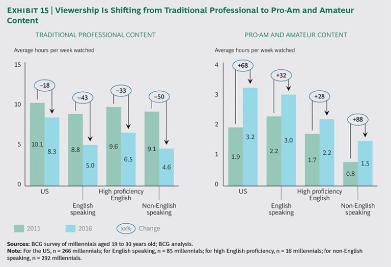 Amateur producers are also hyperlocal, and in many ways, they have replaced some of the domestic professional content development in the middle that has been squeezed out, especially in non-English-speaking markets. For example, blogger Clara Henry has become a national hit in Sweden, generating almost 60 million views on her YouTube channel, where she interviews people and does comedy sketches, all in Swedish. A BCG survey of college-educated millennials in 50 countries found that millennials are consuming a growing share of pro-am and amateur video content—a 30% to 90% increase, depending on the market, from 2011 through 2016. (See Exhibit 15.)