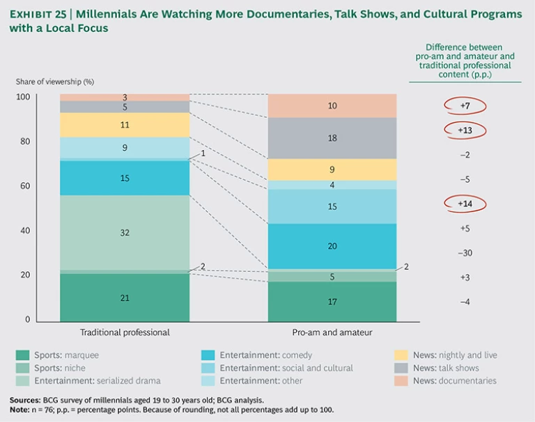 Finally, millennials are watching more news and culturally relevant shows from pro-am and amateur producers than from traditional professional content creators. Millennials’ pro-am and amateur content viewing reflects a greater mix of documentaries, talk shows, and social and cultural programs with a markedly local focus. (See Exhibit 25.) A Swedish TV expert told us that “the blogger space is pretty big in Sweden. The number of unique visits as a percentage of the population is very high: some shows have half a million or a million unique hits per month.”