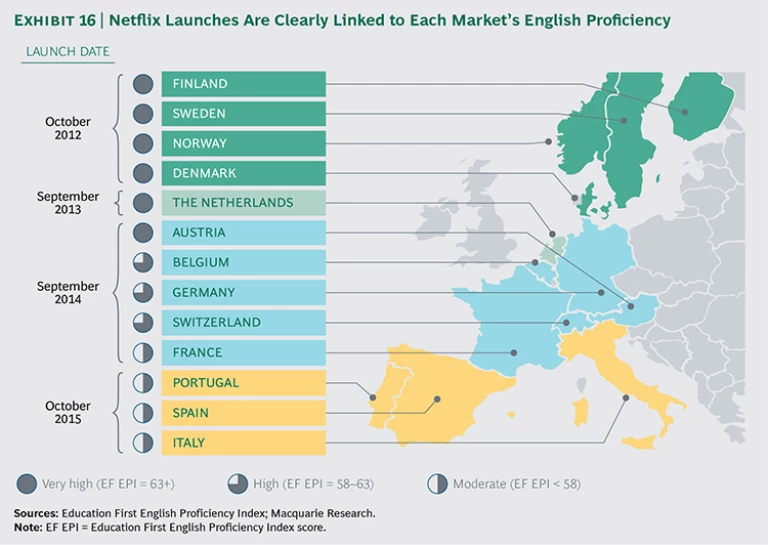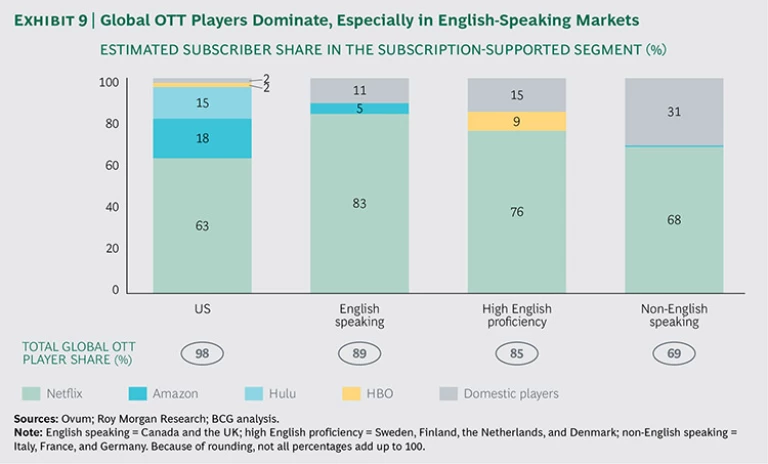 It is not surprising that language looms large in determining OTT’s market-by-market penetration. Because the global OTT players hail from the US, they have been quicker to move into other English-speaking countries and countries where English is widely used even though it is not the primary language. (See Exhibit 16.)