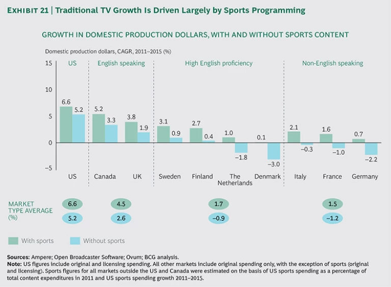 Sports programming remains a driver of domestic and global growth for traditional TV. In some markets, it is lifting otherwise flat or negative trends in spending for traditional TV content. Without sports programming, some markets, such as Italy and France, would be declining in terms of content production dollars. (See Exhibit 21.)