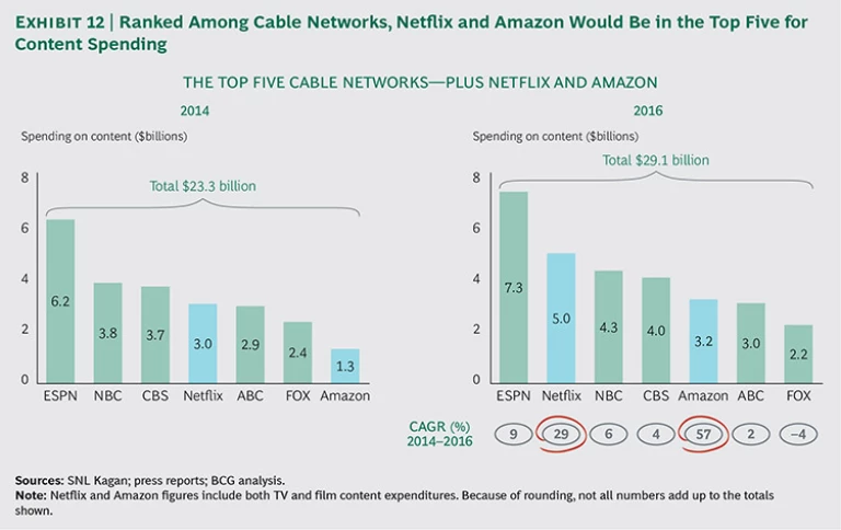 US producers dominate this tier. According to an analysis by the Los Angeles Times, more than 400 original US productions were greenlighted in 2015, compared with about 200 in 2009. OTT is at the forefront of this surge: Netflix and Amazon would rank second and fifth, respectively, in programming spending among all US cable networks—the top-spending cable networks in the world. (See Exhibit 12.) Not only are the OTT titans spending more, but they are also carrying their traditional competitors up the spending curve with them. OTT players are increasing demand (and the ability to pay) for original-content productions, requiring traditional players to invest more deeply in original content to differentiate and secure audiences in a far more competitive environment. The net result, at least for the near term, is that there is more competition for top-quality content, and unique content is more valuable than ever before.