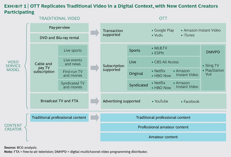 Finally, OTT and traditional TV are further differentiated by the content creators that participate in the space. By eliminating constraints on content distribution and space, OTT has introduced new types of content creators to the market. (See Exhibit 1.)