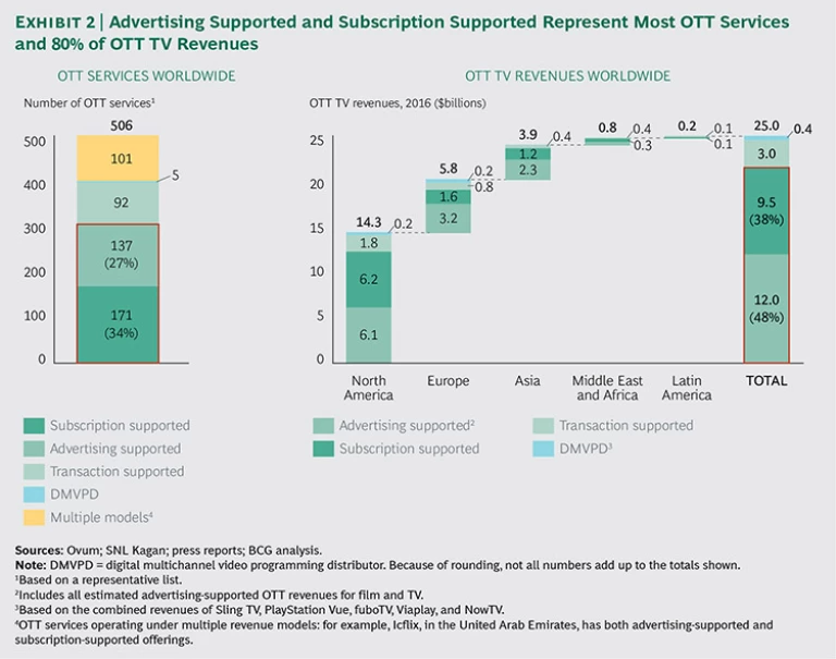 Advertising- and subscription-supported services have, however, materially disrupted the industry with new content models (such as short-form and original content), “windowing” (new approaches to content release), and innovative pricing and value chain relationships (such as Amazon Prime, which, for a set annual fee, bundles high-quality video content with free product shipping). Of the more than 500 OTT services available globally, the vast majority operate advertising- and subscription-supported business models. These players have captured more than 80% of global OTT revenues. (See Exhibit 2.)