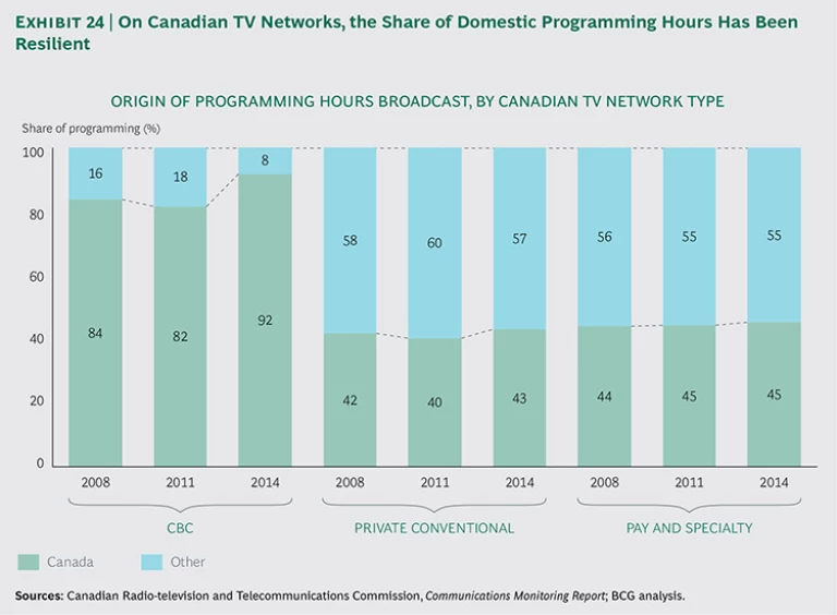 The same dynamic seems to hold in English-speaking markets as well. In Canada, for example, the share of domestic programming on CBC Television, conventional, and pay and specialty channels either stayed flat or rose from 2008 through 2014. This may be, in part, a result of domestic networks’ efforts to differentiate themselves from Netflix and other US-dominated OTT options. (See Exhibit 24.)
