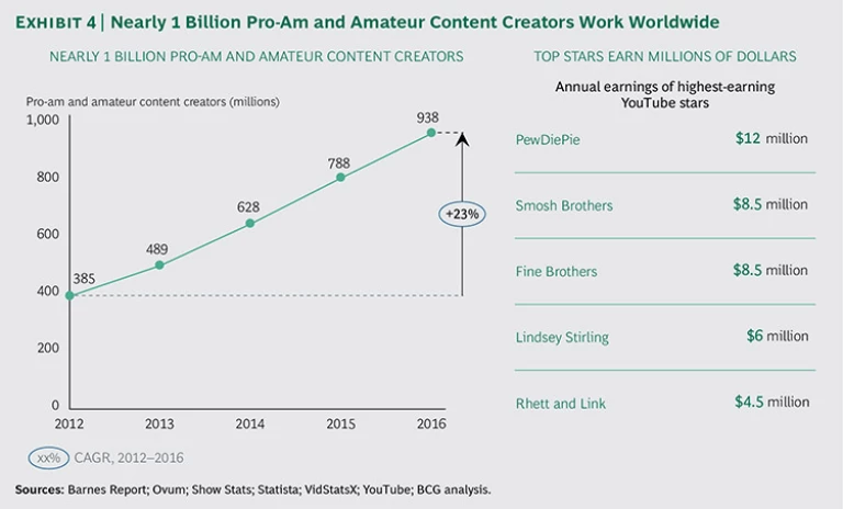 This democratization of consumer access has provided audiences for all kinds of content creators. What many have perhaps failed to recognize is that there are now 1 billion content creators around the world. And although most are amateurs, participating in it as a hobby rather than as a profession, some amateurs are earning millions of dollars, and all are contributing to the depth and breadth of content available to consumers. In the study of the impact of OTT and internet video on content production, one must consider the full range of content producers, not only the professional enterprises that serve the legacy TV ecosystem. (See Exhibit 4.)