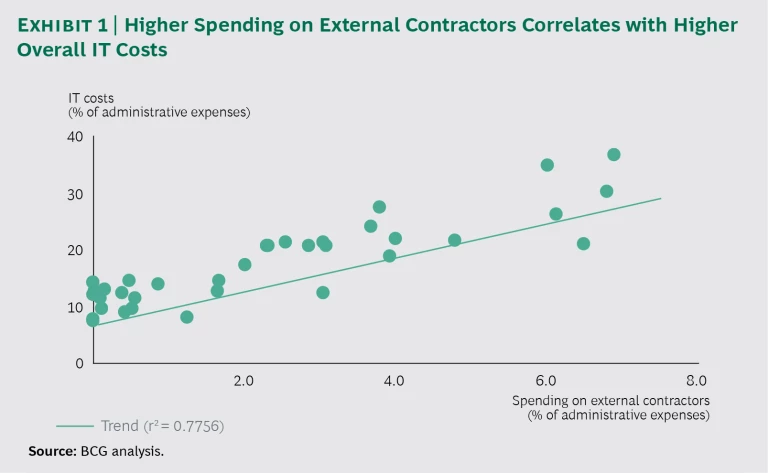 External Contractors. Running an IT function without external contractors would be difficult. These individuals bring many benefits, including new skills and methodologies, to the table and can improve the flexibility of the IT department as a whole. But they can also escalate IT costs. Indeed, we find a strong correlation between overall IT costs and money spent on external contractors. This is not to say that there aren’t exceptions—that is, companies with relatively high spending on external contractors and relatively low IT costs. But we observe that, typically, the more a company spends on external contractors, the higher its IT costs are likely to be. (See Exhibit 1.)