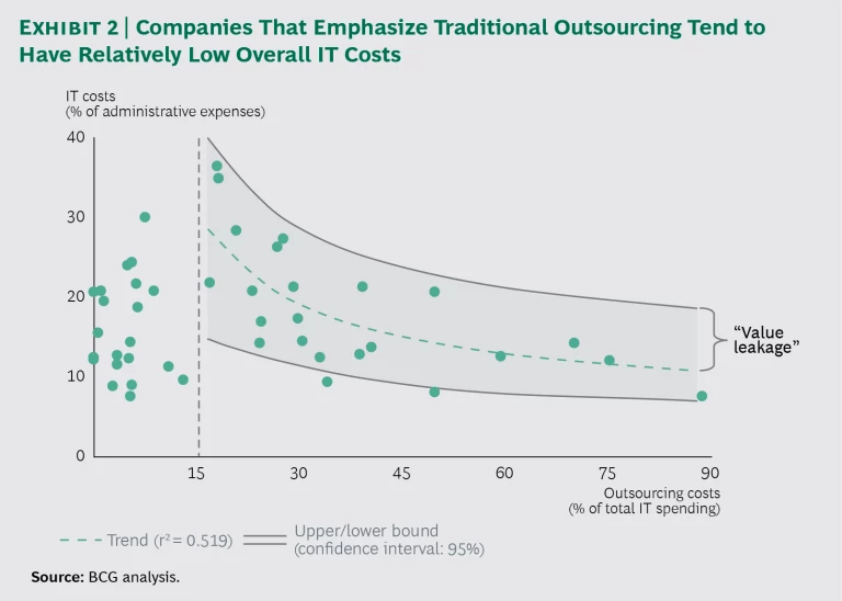 In contrast, companies for which traditional IT outsourcing is a relatively large part of their total IT spending tend to have relatively low overall IT costs. (See Exhibit 2.) Our experience indicates that this tendency is due mostly to these companies’ emphasis on optimizing the execution of their outsourcing program. These companies develop sophisticated vendor management organizations, for example, that can manage deals and negotiate complex contracts.