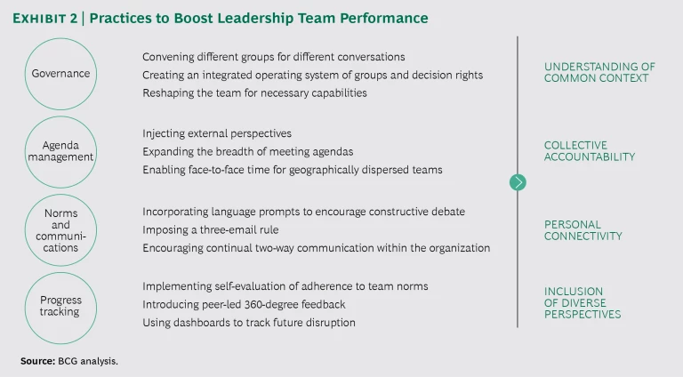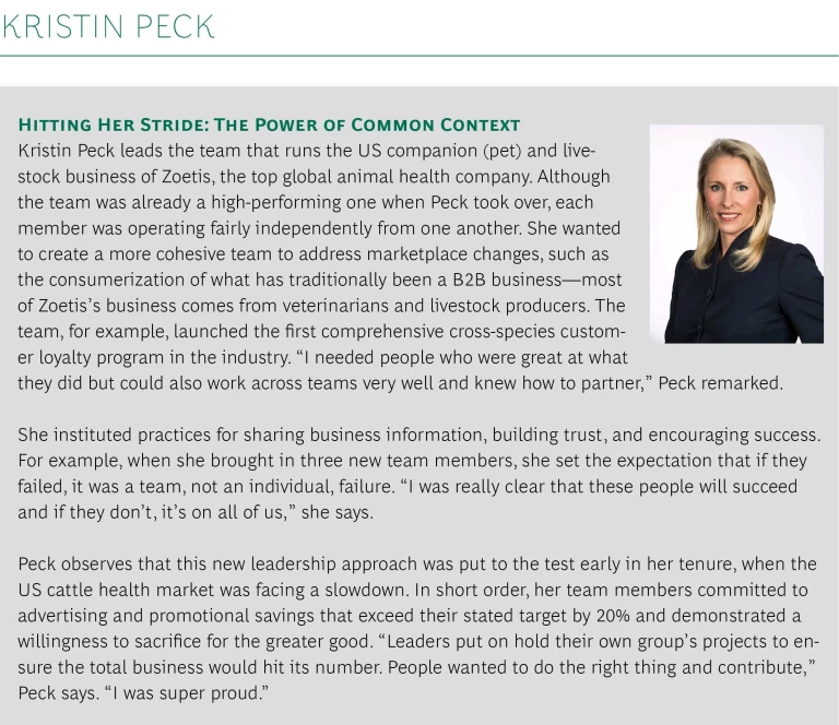 Leaders play a critical role in setting aspirations and fostering this self-reinforcing environment. They do this through word and deed, instituting a discipline of practices that lay the foundation for a more productive team operating model. Later in this article, we identify a dozen representative examples of these practices that both energize the team and fuel business performance.