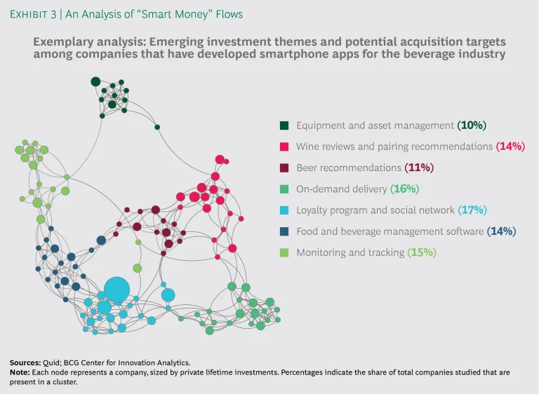 - Analysis of “Smart Money” Flows. By applying natural language processing to data from Capital IQ and Crunchbase, Quid creates a thematic map of companies based on their common products, technologies, and services. This mapping gives the company a segmented view of where venture capital is flowing within a given investment range. The analysis has been used to identify emerging investment themes and to highlight potential acquisition targets with great specificity. For example, such a scan can identify companies that have developed smartphone apps for the beverage industry. (See Exhibit 3.)