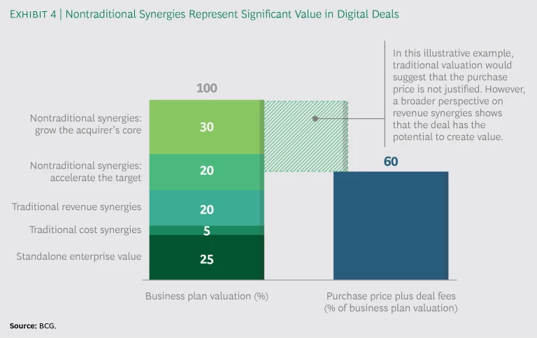 To evaluate the economics of an acquisition, dealmakers have traditionally determined the target’s enterprise value and developed a business plan that estimates the cost and revenue synergies generated by integrating the target into the acquirer. If enterprise value and synergies exceed the acquisition price, then the deal has a positive business case. However, this traditional approach fails to capture two categories of revenue synergies that are critical to justifying the high multiples of digital acquisitions:
