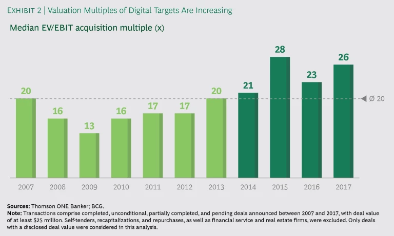 The average value of digital deals involving corporate acquirers was $151 million in 2017. Deal activity focused on relatively nascent companies: 81% of digital deals were valued at less than $100 million, while only 3% exceeded $1 billion. Digital companies sold at near record multiples—the median EV/EBIT multiple was 26x. (See Exhibit 2.)