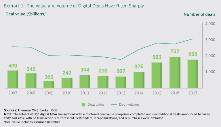 Indeed, corporations’ appetite for digital acquisitions has accelerated rapidly. In 2017, the global value of digital M&A deals reached $658 billion—more than double the value five years earlier. (See Exhibit 1.)