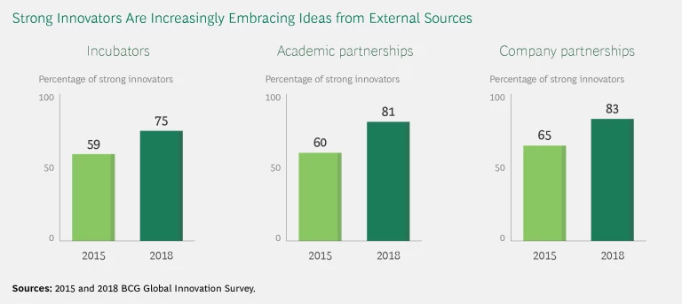 In business life today, companies need to look beyond their own walls for new ideas. We have seen big increases in the use of such partnership models as corporate venture capital, incubators, and accelerators. Our current innovation survey found that incubator use among self-described strong innovators rose from 59% in 2015 to 75% in 2018, that tapping into academic relationships jumped from 60% to 81% during the same period, and that formation of company partnerships increased from 65% to 83%. (See the exhibit.)