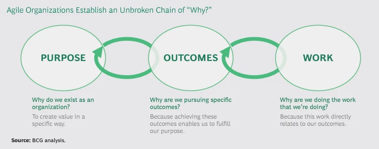 We have written before about the importance of defining objectives and desired outcomes—the why of what a company does—as well as of focusing on principles over practices, putting the right leadership in place, and establishing alignment to enable autonomy. For agile to be successful, all of these pieces must be in place. Agile organizations are especially good at establishing “an unbroken chain of why,” which is simple in conception but far from easy to implement. (See the exhibit.) This unbroken chain establishes links between the business outcomes that the company needs to achieve and the work that individual teams are charged with delivering. A well-run agile process reinforces the chain of why and defines clear outcome metrics. Even if a company isn’t applying agile, the unbroken chain of why can still have tremendous value.