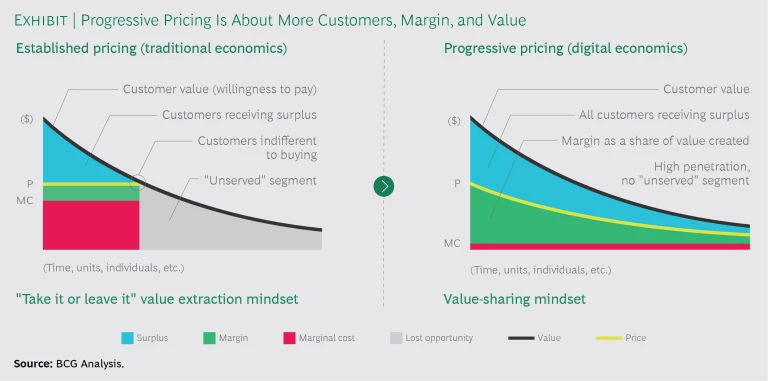 Progressive pricing enables that differentiation by pushing the logic of discrete price points to its practical limit, offering each customer a fair, personalized product and price point. What makes this possible are the properties of digital economics, built on the idea that added value is customizable at zero marginal cost. Instead of optimizing a small number of price points, the firm optimizes a continuum of prices. The key element is a value-sharing algorithm that dynamically sets prices specific to the value an individual customer derives based on time, location, and occasion.