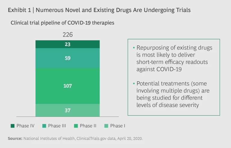 Potential treatments for COVID-19 are evolving with unprecedented speed, and data and results from several clinical trials are expected in the coming months. More than 200 active clinical trials are underway, including multiple trials for the same drugs. (See Exhibit 1.) Several trials seek to establish the efficacy of existing therapies, including more than 80 Phase III and IV trials. There are positive signs of potential benefits across multiple drug classes and candidates.