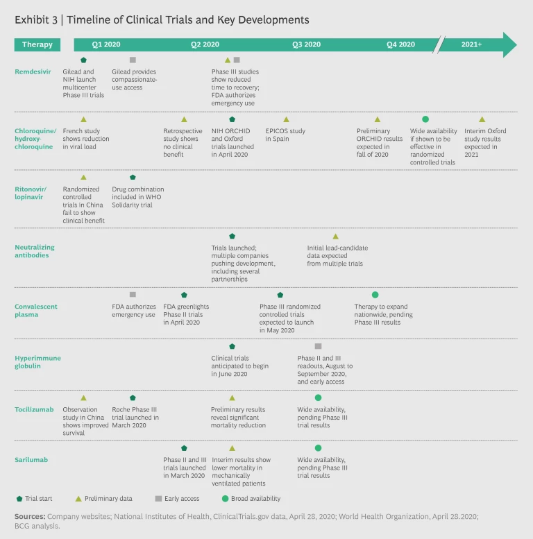 This is the first of two articles on the outlook for and potential timing of treatments and vaccines for COVID-19. The goal is to provide practical assessments of the health care industry’s efforts for business leaders and public health officials who need to plan for the future of their companies and communities. In this article we examine the landscape of possible treatments. It is based on broader research conducted by the BCG scientist network, which comprises more than 500 individuals around the world with advanced degrees (MDs and PhDs) and relevant private-sector experience.