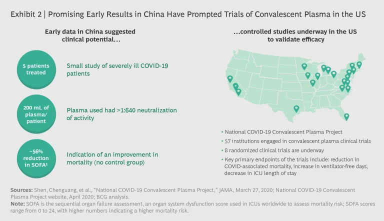 Neutralizing Antibodies. Patients who recover from COVID-19 typically generate antibodies against the virus. Convalescent plasma and hyperimmune globulin are two neutralizing antibody therapies that have entered clinical trials in the US, following favorable results from observational studies in China. (See Exhibit 2.) Convalescent plasma treatment involves purifying the blood serum from recovered patients and administering it to high-risk individuals. Convalescent plasma can be used either as a prophylaxis to prevent initial infection or as a treatment to limit the spread of the infection among cells. While the approach has proven effective for high-risk groups—particularly frontline health care workers—in previous viral outbreaks (such as H1N1 flu and Ebola), it is challenging to manufacture the plasma at scale. According to FDA guidelines, one donor can provide three treatment units of convalescent plasma, which can treat six patients.