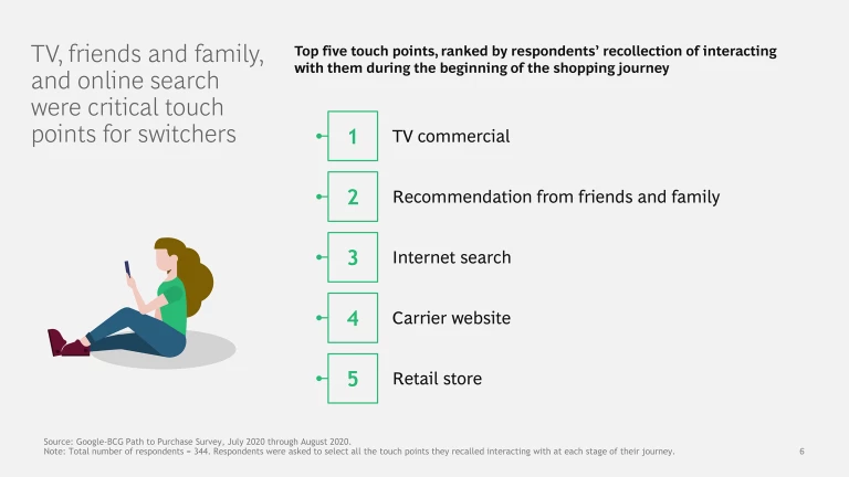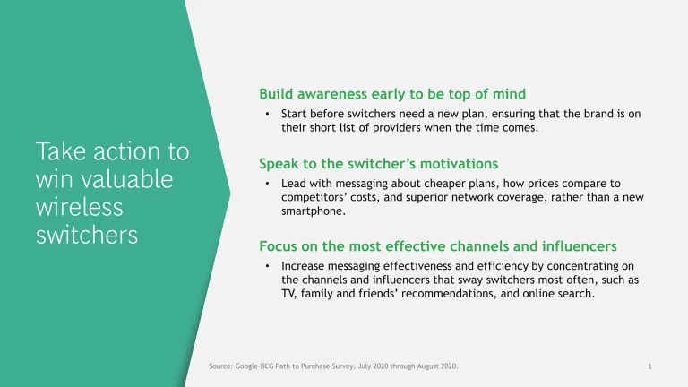 For example, to attract switchers at the most critical point of the journey—the beginning—carriers need to build awareness in advance by running ads on TV, encouraging existing customers to give recommendations to friends and family, and capturing the attention of potential switchers while they are searching for a new plan online. As a case in point, of the switchers in our survey, 24% recalled getting a recommendation from a friend or family member at the start of their shopping journey. That is four times higher than the average percentage of respondents who recalled interacting early in the journey with any of the other 37 touch points mentioned in our survey.