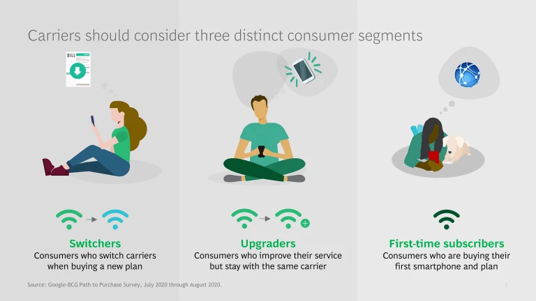 The distinction is important for carriers. Switchers and first-time subscribers offer the potential for providers to capture significantly more customer lifetime value, making it a priority for carriers to understand how to win a greater share of these categories. However, these consumers can be more difficult for carriers to understand, given the lack of a preexisting relationship. Upgraders, in contrast, create value for their carrier by being loyal to the brand, extending the lifetime of their plan, and not contributing to churn.