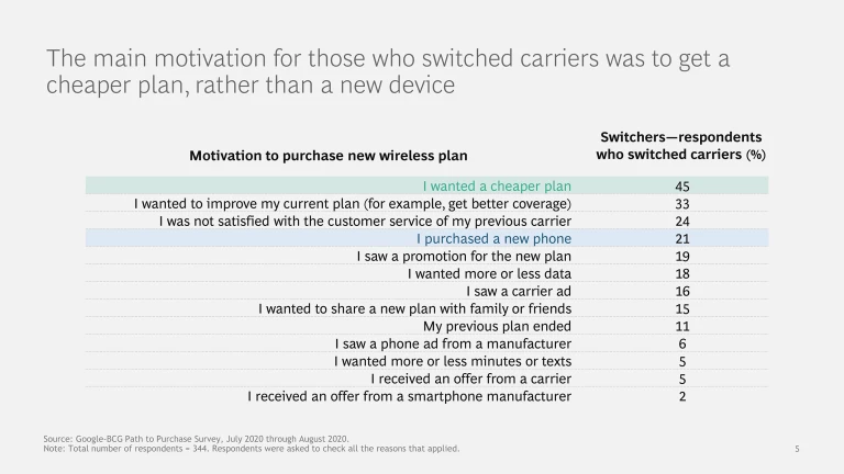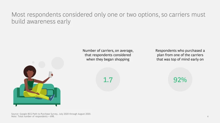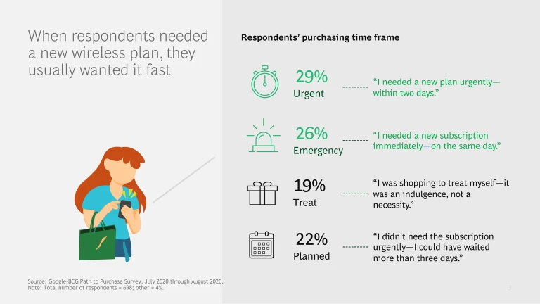 The Google-BCG Path to Purchase Survey was conducted from July 2020 through August 2020. Our aim was to understand how consumers are making purchases across a wide variety of categories. It asked approximately 13,700 US consumers about their most recent shopping trip for certain products—that is, within the 12 months prior to the survey. For this article, we have focused on the findings from approximately 700 respondents who bought a new wireless plan. About half of these respondents purchased a new plan after the onset of the COVID-19 crisis in March 2020.