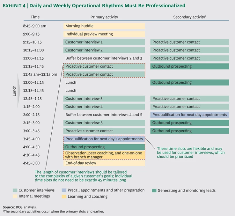 Branch Organization and Management. Best-practice banks professionalize the operational rhythms of their branches by instituting daily staff meetings 15 minutes before opening (the “morning huddle”), systematically reviewing commercial results during weekly meetings, and installing guidelines for spending noncommercial and idle time. (See Exhibit 4.) They also use sharp and focused management information at the regional, area, and branch levels to diagnose the activity mix and improve performance.