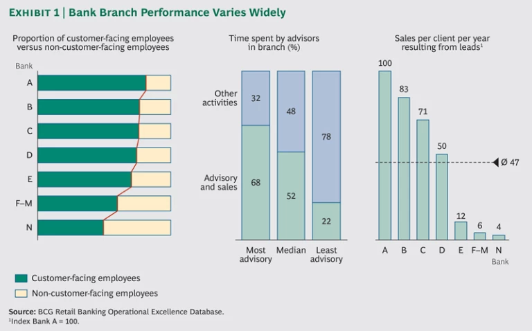 Fully diagnose branch network performance. Diagnosing branch performance begins with an external benchmarking of overall network productivity against top retail banks worldwide. In our work with clients, we have utilized BCG’s Retail Banking Operational Excellence Database, which compares performance among about half the top 40 retail banks globally across up to 160 metrics. Branch performance tends to vary widely. (See Exhibit 1.)