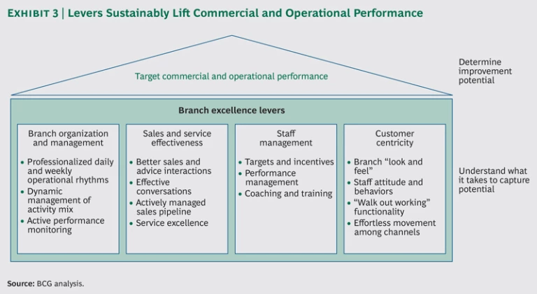 Banks with best-practice networks not only implement a series of critical commercial and operational levers from their branch-excellence programs, but they also work on them holistically to achieve maximum impact. The key categories of levers are branch organization and management; sales and service effectiveness; staff management; and customer centricity. (See Exhibit 3.)