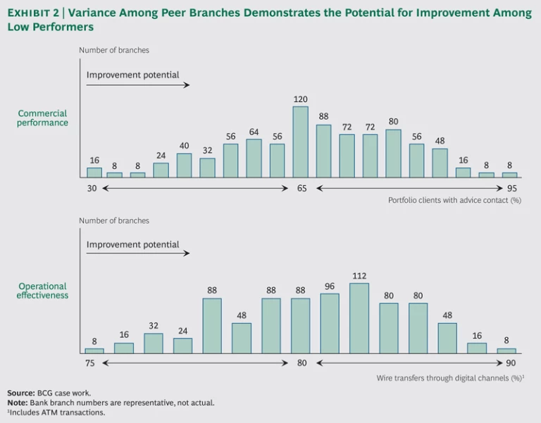 An additional internal benchmarking within a bank’s own network allows us to compare individual branch performance with clusters of comparable peer branches. The high variance in performance among peer branches demonstrates the potential for improvement for low performers. (See Exhibit 2.)