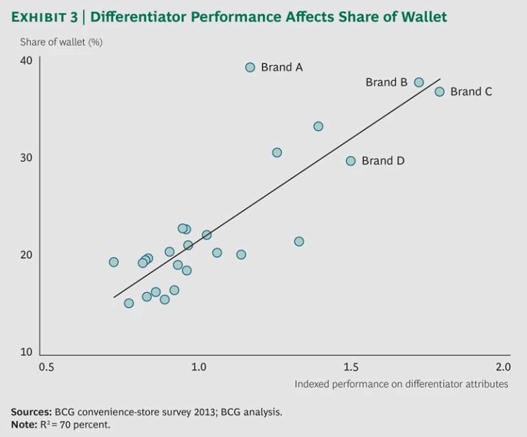 - Differentiators. These are attributes that are highly valued but perceived by consumers as relatively rare—the basis of distinction for retailers that may translate into a higher share of wallet. They are attributes that consumers directly indicate are important and that measurably affect how those consumers think about the brand. For example, cleanliness is a differentiating attribute that strongly affects consumer satisfaction and choice as well as retailers’ share of wallet.